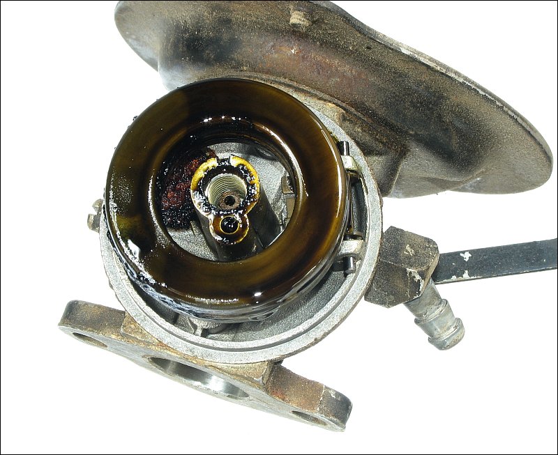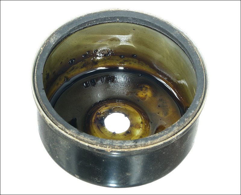 This engine uses a gravity fed, float type carburetor. This one was stored for about 4 years with no preparation. The old fuel was simply left to break down into a nice sludge. It was so bad that the fuel hard hardened in the threads. There was some concern that the retaining nut was going to break off when trying to remove it. If the carburetor would have been expensive to replace if damaged, it would have been soaked in carburetor cleaner to break up some of the varnish before attempting to remove it. Below, you can see the float, the bowl retaining nut and the bowl.