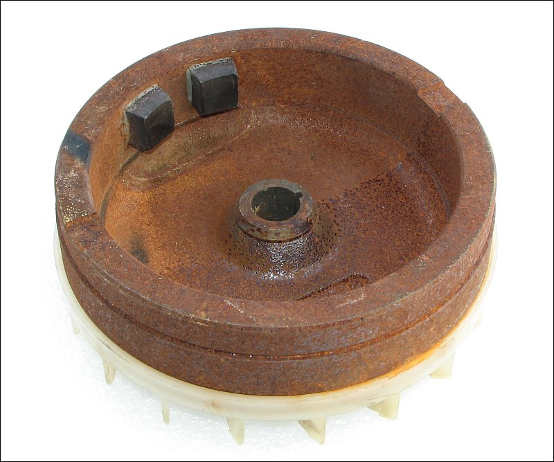 Flywheel: The next image is the back side of the flywheel. As you can see this a massive piece of iron. The two black items are magnets. On some flywheels, the magnets are inside the rim but most magnets are on the outside of the rim.
