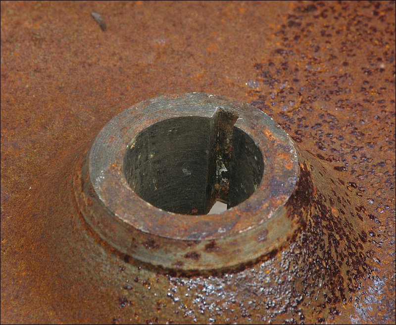 ![]() Below, you can see the center bore in the flywheel. The slot in the bore is the keyway. This slot is kept in alignment with the slot in the crankshaft by a piece of keystock. The flywheel has to be synchronized or 'in time' with the crankshaft because the magnets that help create the high voltage that produces the spark have to pass over the poles of the ignition coil at precisely the right time.
