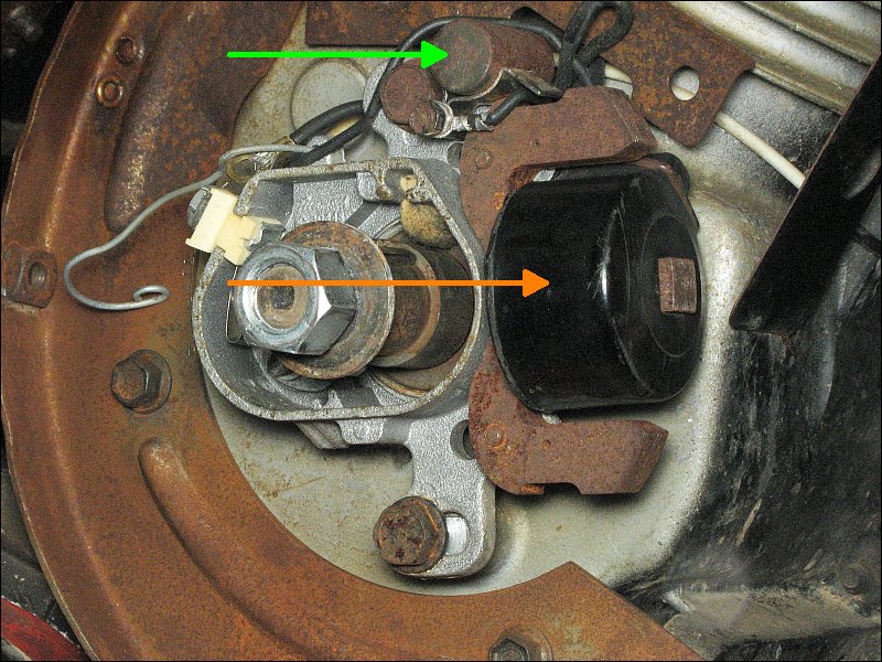 ![]() Above, you can see a piece of felt. This is supposed to be oiled (a couple of drops of motor oil is enough). It brushes against the lobe to keep it clean and lubricated to reduce wear of the soft plastic cam follower on the breaker points. In the next photo, the green arrow points to the condenser. The orange arrow points to the ignition coil.