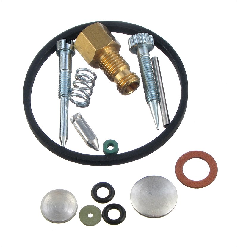 ![]() When cleaning a carburetor like this one, you can sometimes reuse the old parts. This carburetor used all metal to metal surfaces for the jets and the needle valve (the one operated by the float). Where possible, it's better if you buy a carburetor 'kit' for the carburetor that you're rebuilding. When you buy a kit, it will often have a few parts missing (those that you're expected to reuse) and a few extra parts (so that the kit covers several models). It will also have a few parts that are only rarely needed. The gray discs are 'Welch' plugs. These cover various cavities in the carburetor body. These can be difficult to replace without doing additional damage to the carburetor. To remove them, you have to punch through them and pry them out. When punching through, you can sometimes damage the ports in the casting under the plug. It's also possible to damage the perimeter of the hole when prying them out. This can make it difficult to get a good seal when the new plug is installed.