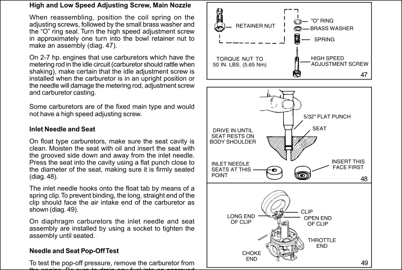 ![]() Sometimes a kit will have parts that seem identical but have very slight differences. In the kit above, the green seal was included to be used as the seat for the needle valve. Originally, the carburetor had a metal to metal valve. To use the rubber seat, you would need a shorter needle than the one that was included. Using the included (or the original) needle wouldn't allow the float to reach the correct (level) position (no matter how far it was bent). The new needle was used without the rubber seat (as the old needle was) and it didn't work reliably. Sometimes the valve would seal and sometimes it would allow an unlimited flow into the bowl which caused fuel to spill out of the carburetor. The new needle had a very slightly blunted tip where the older needle had a sharper point. Another problem with this kit was the main jet. The jets must be able to hit their seats so that they can seal completely. They won't be used in the closed position but they have to be able to get there because they may need to operate very close to completely closed. The kit's components looked identical to the original parts but they were not. The main jet would not screw into the bowl nut far enough to seat. You could screw the jet in completely then screw in the bowl nut and the nut would bottom out against the carburetor body. The problem would have been even worse (the jet's needle would have been held even further from its seat) if the bowl and the washer would have been in place (as they would have been when the carburetor was fully assembled). This was obviously not right because the needle of the jet should have contacted the seat before the nut bottomed out. With the original jet screwed completely into the original bowl nut, the jet would bottom out about 1/16th of an inch before the nut bottomed out. If you've never rebuilt a carburetor of the type you are working on, it's easy to forget where every washer and seal goes. If you look up the service manual for the engine or carburetor, there will be exploded diagrams that show the placement and order of the various components. For example, on the main jet, you have to install the tension spring, the brass washer and the o-ring in that order. Below is an example of the information that is included in the 3-11hp L-head technician's manual published by Tecumseh.